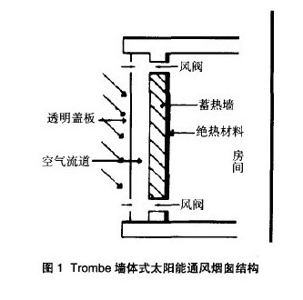 自然通风是一项改善建筑热环境、有效降低空调耗能的常用技术。当室外空气温度较低、湿度不大时,可直接采用自然通风降低室内温度,带走潮湿气体,从而节约大量能源;即使室外空气温度超过舒适区,也可以利用自然通风把处理后的新风送到室内,从而省去风机能耗。太阳能强化自然通风就是通过建造太阳能烟囱,利用太阳能来加热房间的排风,提高排风温度和增加热压,增强室内通风风量,从而达到降低室温的目的。比较典型的太阳能烟囱主要有3种:Tmmbe墙体式、竖直集热板屋顶式和倾斜集热板屋顶式。