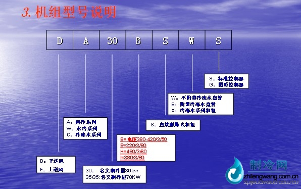 A——冷凝方式(A:风冷 W:水冷 C:冷冻水机组)