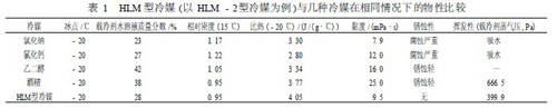 HLM型冷媒的冰点温度可达到- 100 ℃,主要由缓冲剂、防锈剂、防霉剂、增溶剂、低碳醇组成。HLM型冷媒是无色或浅色透明液体,纯品易燃,稀释后的水溶液不燃,无异味。