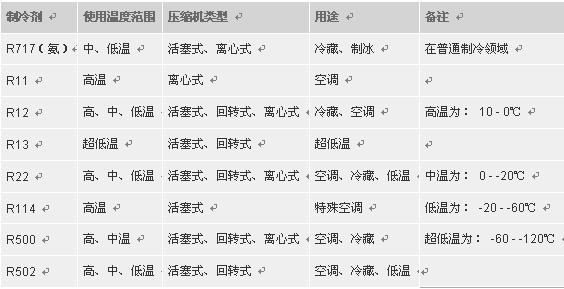 氟里昂(卤碳化合物制冷剂):氟里昂是饱和碳氢化合物中全部或部分氢元素(CL)、氟(F)和 溴(Br)代替后衍生物的总称。国际规定用 “ R ” 作为这类制冷剂的代号,如 R22... 等。